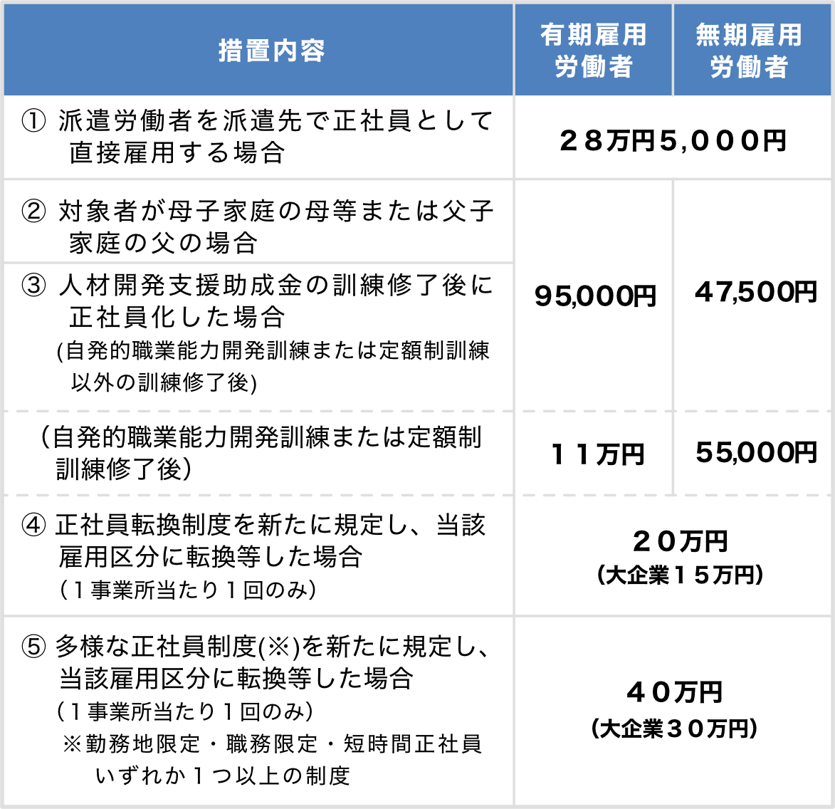 ※多様な正社員(勤務地限定・職務限定・短時間正社員)へ転換等(派遣労働者の直接雇用含む)した場合も正規雇用労働者へ転換等したものとみなします。